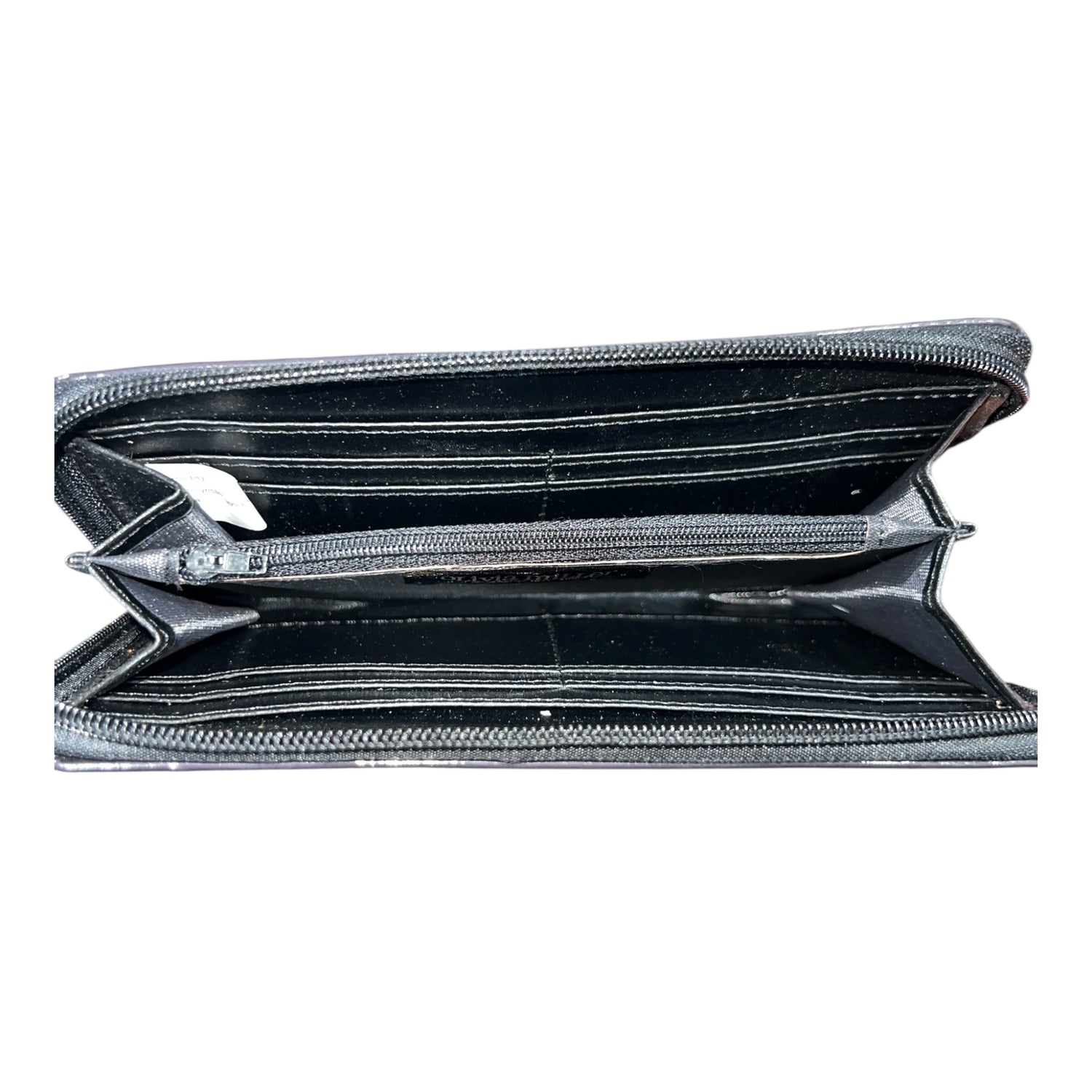 - Wallet zips open to reveal slots for credit cards, slot for cash, and a small zippered pocket for change.
